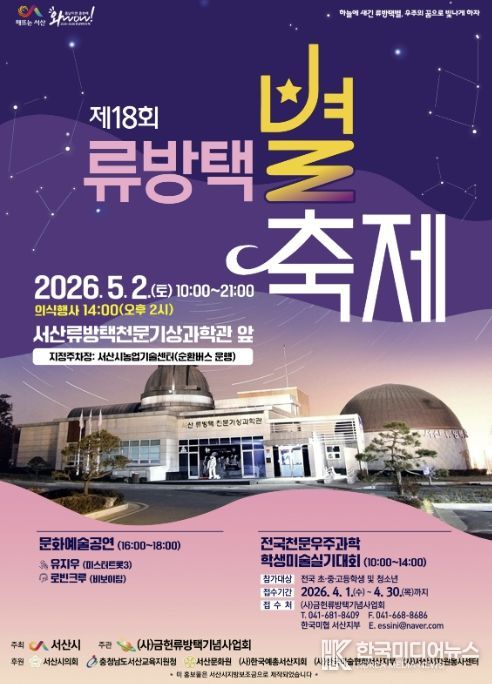 [ 한국미디어뉴스 이원영 기자 ] 충남 서산시는 오는 5월 2일 류방택천문기상과학관 일원에서 제18회 류방택 별축제를 개최한다고 밝혔다.