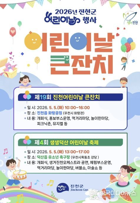 [ 한국미디어뉴스 김풍옥 기자 ] 충북 진천군은 제104회 어린이날을 맞아 5월 5일 진천읍 화랑공원과 덕산읍 유소년축구장 두 곳에서 어린이날 기념행사를 개최한다고 밝혔다.