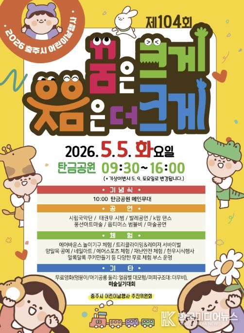 [ 한국미디어뉴스 김풍옥 기자 ] 충주시는 오는 5월 5일 오전 9시 30분부터 탄금공원에서 ‘제104회 어린이날’을 기념하는 ‘2026 어린이날 행사’를 개최한다고 밝혔다.