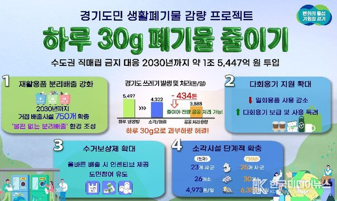 [ 한국미디어뉴스 김일규 기자 ] 수도권 직매립 금지에 따른 생활쓰레기 감량을 위해 경기도가 2030년까지 5년간 약 1조 5,447억 원을 투입하는 ‘하루 30g, 도민실천형 생활폐기물 감량 프로젝트’를 추진한다.