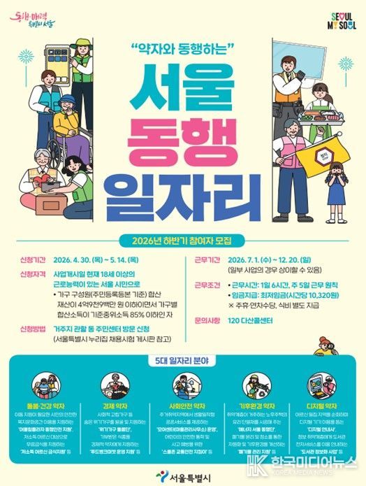 [ 한국미디어뉴스 이원영 기자 ] 서울시가 저소득, 실업자 등 취업 취약계층이 디지털 안내, 돌봄, 안전 지원 등 다양한 현장에서 또 다른 사회적 약자를 돕고 자존감을 회복하는 ‘서울 동행일자리’를 올 하반기에 확대한다. 시는 돌봄건강·경제·사회안전·디지털·기후환경 등 5개 분야 763개 사업에서 시·구 합산 총 6,943명 규모로 참여자를 모집한다.