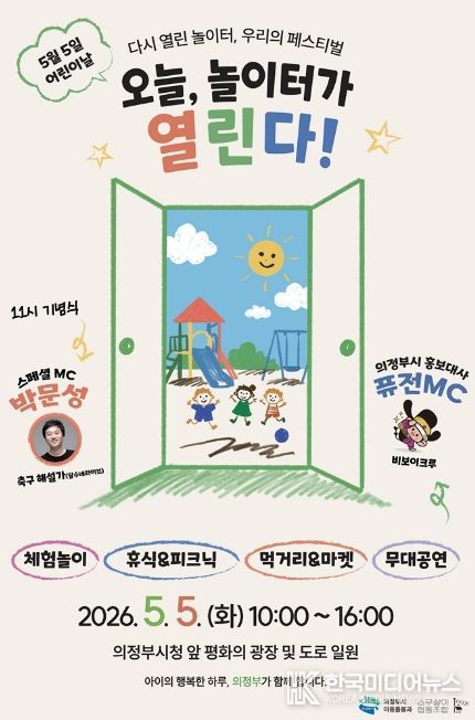 [ 한국미디어뉴스 정석환 기자 ] 의정부시는 제104회 어린이날을 맞아 5월 5일 오전 10시부터 오후 4시까지 의정부시청 앞 평화의 광장 및 도로 일원에서 ‘2026년 의정부시 어린이날 기념행사’를 개최한다.
