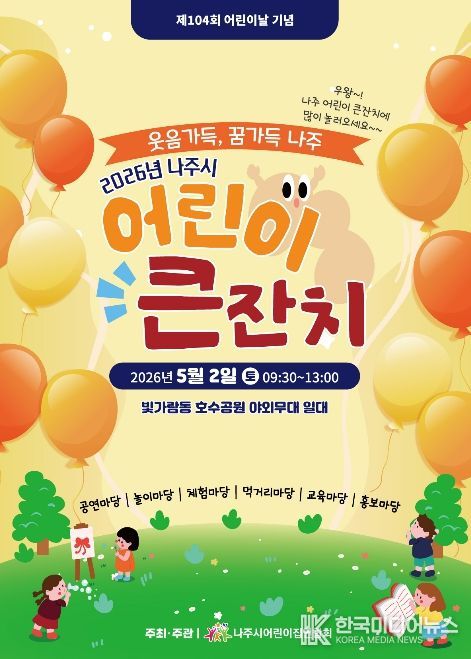 나주시는 오는 5월 2일 오전 9시 30분부터 빛가람호수공원 야외무대 일원에서 나주시어린이집연합회 주최로 ‘2026년 나주시 어린이 큰잔치’를 개최한다고 29일 밝혔다.