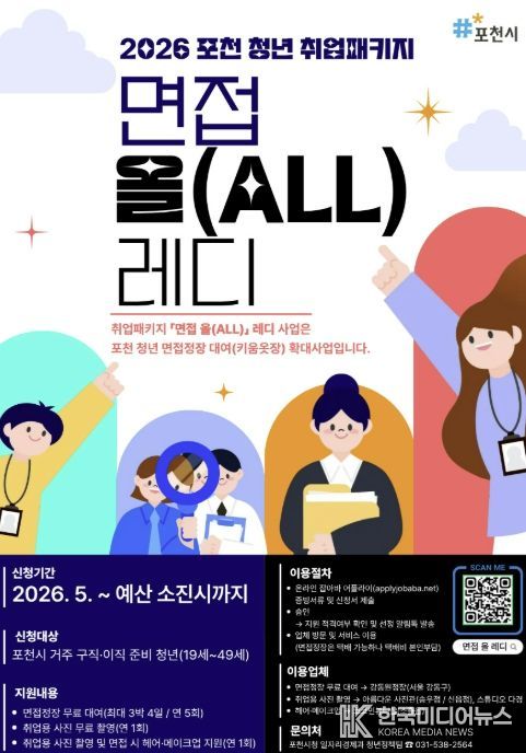 [ 한국미디어뉴스 김서안 기자 ] 포천시는 구직 및 이직을 준비하는 청년들의 취업 준비 부담을 낮추고 취업 경쟁력을 높이기 위해 오는 5월 2일부터 2026 포천 청년 취업패키지 ‘면접 올(ALL) 레디’ 사업을 운영한다.