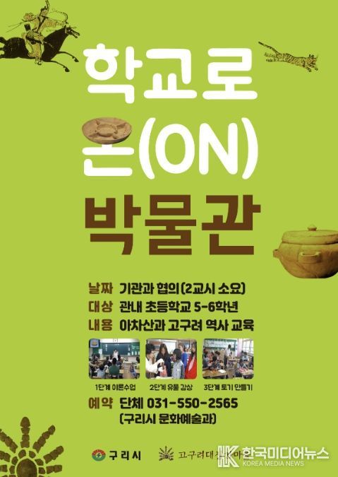 [ 한국미디어뉴스 김서안 기자 ] 구리시는 4월 28일부터 오는 9월까지 고구려 유물 상자를 들고 관내 초등학교를 찾아가는 ‘학교로 온(ON) 박물관’프로그램을 운영한다고 밝혔다.