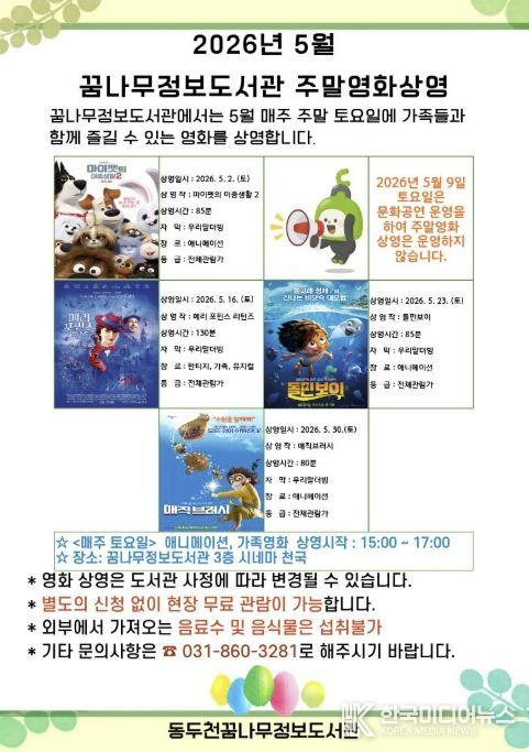 [ 한국미디어뉴스 정석환 기자 ] 동두천시 도서문화사업소 정보도서관에서는 오는 5월 매주 토요일 어린이와 가족을 위한 애니매이션 및 가족영화 4편을 상영한다고 밝혔다.