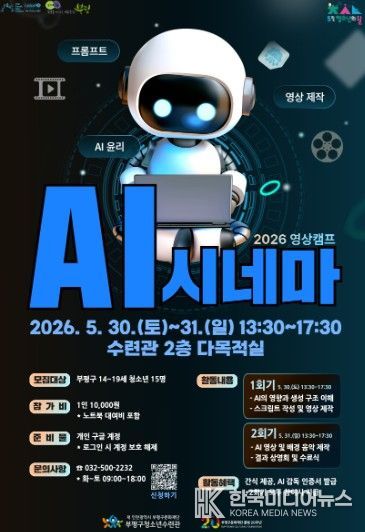 [ 한국미디어뉴스 양선희 기자 ] 부평구청소년수련관은 오는 5월 30일부터 31일까지 진행하는 ‘2026 영상캠프 AI 시네마’ 참가자를 모집한다고 밝혔다.