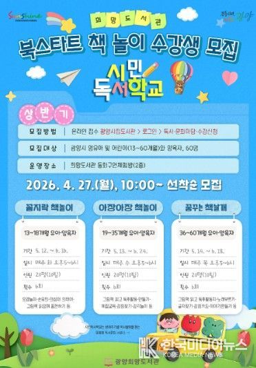 [ 한국미디어뉴스 이종철 기자 ] 광양희망도서관은 ‘2026년 상반기 시민독서학교’의 일환으로 영유아 대상 ‘북스타트 책놀이’ 프로그램 수강생을 모집하고 있다.