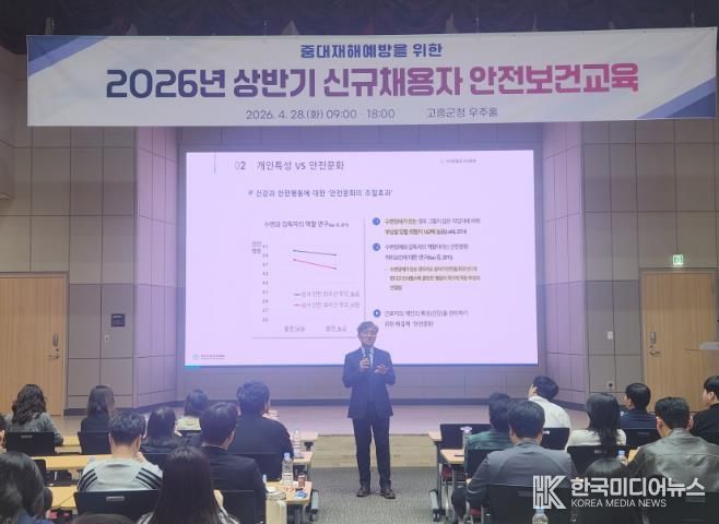 [ 한국미디어뉴스 이종철 기자 ] 고흥군은 지난 28일 군청 우주홀에서 신규채용자 38명을 대상으로 산업재해 예방과 안전한 근무환경 조성을 위한 2026년 상반기 신규채용자 안전보건교육을 실시했다고 밝혔다.