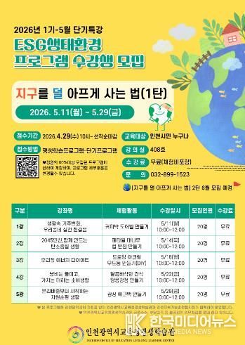 [ 한국미디어뉴스 이원영 기자 ] 인천광역시교육청평생학습관은 4월 29일부터 인천시민을 대상으로 '지구를 덜 아프게 사는 법' ESG 생태환경 프로그램 1기 수강생을 모집한다.