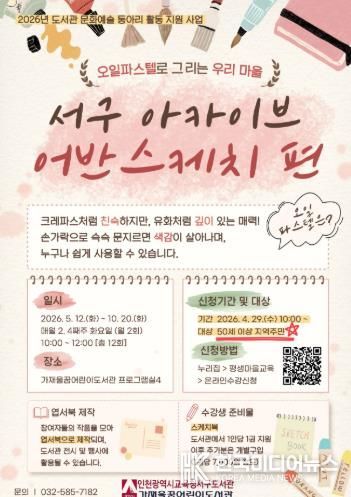 [ 한국미디어뉴스 이원영 기자 ] 인천광역시교육청서구도서관은 29일부터 50세 이상 지역 주민을 대상으로 우리 마을의 풍경을 그림으로 기록하는 문화예술 프로그램 ‘서구 아카이브 어반스케치 편’ 참여자를 모집한다.