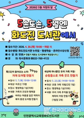 [ 한국미디어뉴스 이원영 기자 ] 인천광역시교육청화도진도서관은 5월 가정의 달을 맞아 유·초등생 동반 가족과 어르신을 대상으로 세대 맞춤형 프로그램 ‘5손도손, 5월엔 화도진도서관에서’를 운영한다.
