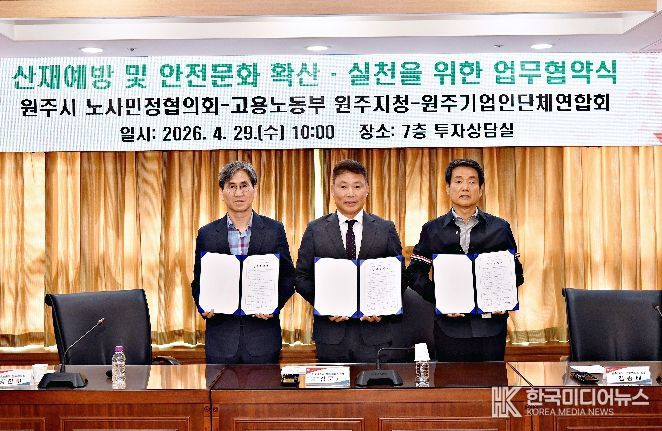 이번 협약은 지역 노사민정 상생협력 사업의 일환인 ‘2026년 찾아가는 小사업장 산재예방 교육’ 추진을 위한 기관 간 업무협약이다. 협약에는 원주시 노사민정협의회와 고용노동부 원주지청, 원주기업인단체연합회가 참여해 안전 문화 확산을 위한 적극적인 지원과 협조를 약속했다.