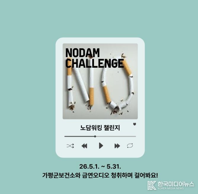 [ 한국미디어뉴스 김서안 기자 ] 가평군보건소가 ‘세계 금연의 날’을 앞두고 5월 1일부터 한 달간 금연 인식 확산을 위한 ‘노담워킹 챌린지’를 진행한다. 이번 행사는 일상 속 걷기 실천과 금연 홍보를 병행해 군민들의 건강한 생활 습관 형성을 돕고자 마련됐다.