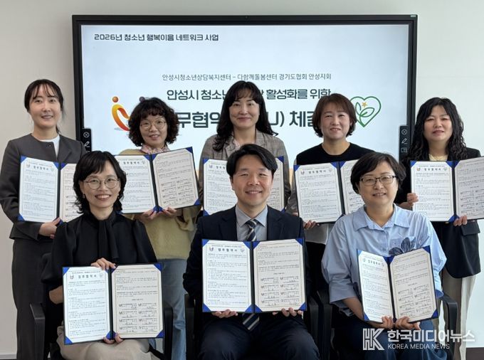 [ 한국미디어뉴스 이보영 기자 ] 안성시청소년상담복지센터는 지난 27일 안성맞춤공감센터에서 다함께돌봄센터 경기도협의회 안성지회와 청소년의 건강한 성장과 복지 증진을 위한 업무협약(MOU)을 체결했다.