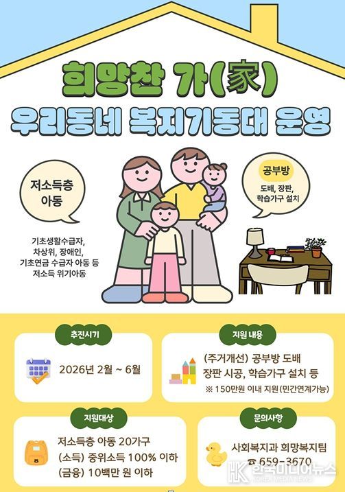 [ 한국미디어뉴스 이종철 기자 ] 여수시는 저소득층 아동의 학습 여건 개선과 안전한 주거공간 조성을 위해 2026년 주거환경 개선사업 ‘희망찬 가(家)’를 추진한다고 밝혔다.