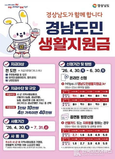 [ 한국미디어뉴스 이원영 기자 ] 경상남도는 4월 30일부터 전 도민을 대상으로 한 ‘경남도민 생활지원금’ 지급 신청을 본격적으로 시작한다고 밝혔다. 이번 지원금은 고물가 등 어려운 경제 여건 속에서 도민들의 생계 부담을 덜고, 지역 내 소비를 촉진해 민생 경제에 활력을 불어넣기 위해 마련됐다.