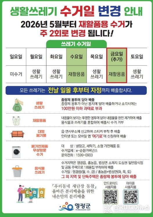 [ 한국미디어뉴스 이종철 기자 ] 영광군은 재활용품 분리배출 활성화와 생활폐기물 불법 배출 방지를 위해 재활용품 수거일을 기존 주 1회에서 주 2회로 확대 운영한다고 밝혔다.