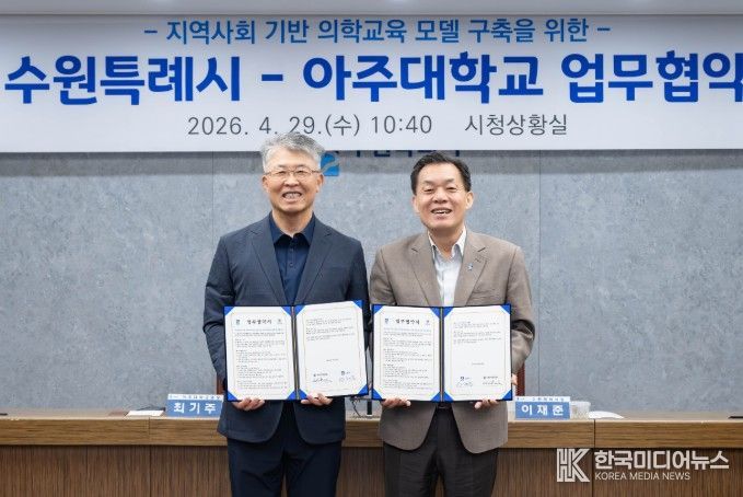수원시와 아주대학교는 29일 시청 상황실에서 ‘지역사회 기반 의학교육 모델 구축을 위한 업무협약’을 체결하고 협력을 약속했다.