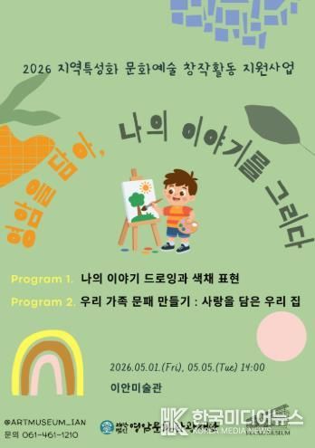 [ 한국미디어뉴스 이종철 기자 ] (재)영암문화관광재단은 오는 5월 1일과 5월 5일 오후 2시, 이안미술관에서 ‘영암을 담아, 나의 이야기를 그리다’라는 주제로 문화예술 교육 프로그램을 진행한다.