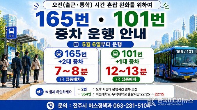 이에 시는 활용 가능한 예비 차량을 혼잡 시간대에 투입해 배차간격을 단축하고, 승객을 분산시켜 차내 혼잡도를 완화하기로 했다. 증차 대상 노선은 165번 노선과 101번 노선으로, 아침 첨두시간대에 집중 배차된다.