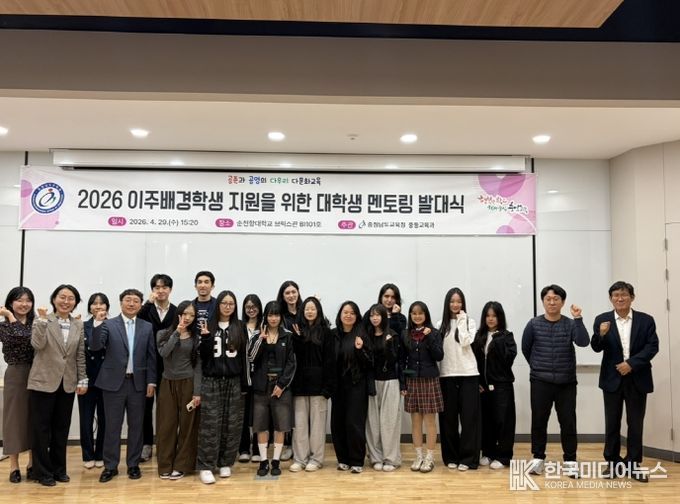 [ 한국미디어뉴스 이원영 기자 ] 충남교육청은 29일, 순천향대학교(아산)에서 순천향대 지도자 학생 6명과 온양용화고·아산충무고 학생 20명, 담당 교사 등 30여 명이 참석한 가운데 ‘2026 이주배경학생 지원을 위한 대학생 지도 발대식’을 개최했다.