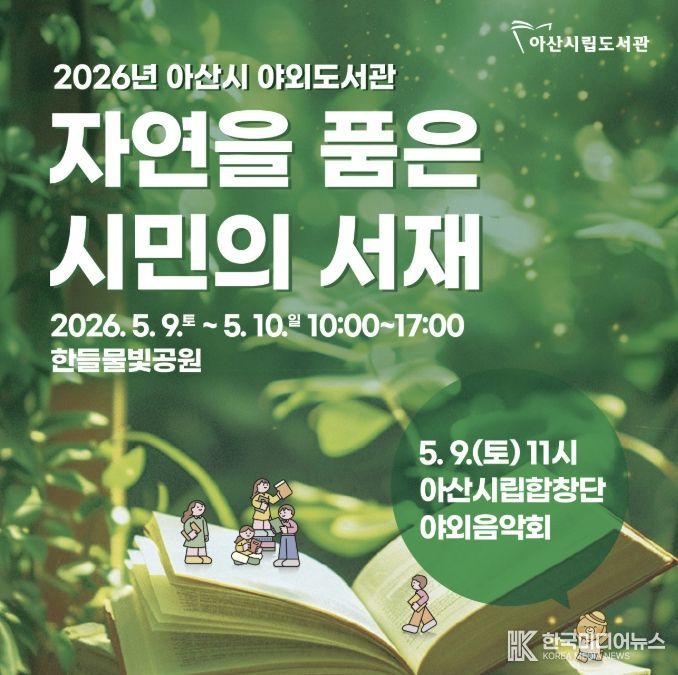 [ 한국미디어뉴스 이원영 기자 ] 아산시립도서관은 오는 5월 9일부터 10일까지 한들물빛공원 일원에서 야외도서관 '자연을 담은 시민의 서재'를 운영한다.