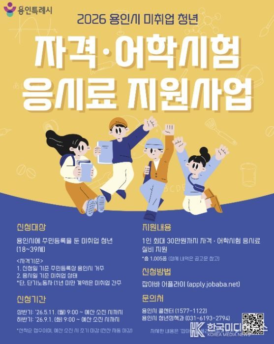 [ 한국미디어뉴스 김일규 기자 ] 용인특례시는 취업을 위해 어학과 자격증 시험 등을 준비 중인 청년을 위해 응시료 30만 원을 지원한다고 30일 밝혔다.