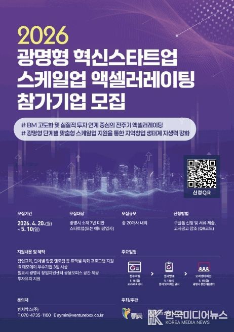 시는 오는 5월 10일까지 ‘2026년 광명형 혁신스타트업 스케일업 액셀러레이팅’ 참가기업을 모집한다.