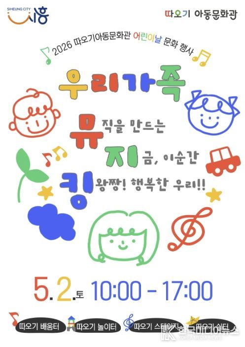 [ 한국미디어뉴스 이보영 기자 ] 시흥시 따오기아동문화관은 어린이날을 맞아 오는 5월 2일 오전 10시부터 오후 5시까지 따오기아동문화관 야외 일대에서 2026년 어린이날 문화행사 ‘우리가족 뮤지킹’을 개최한다.