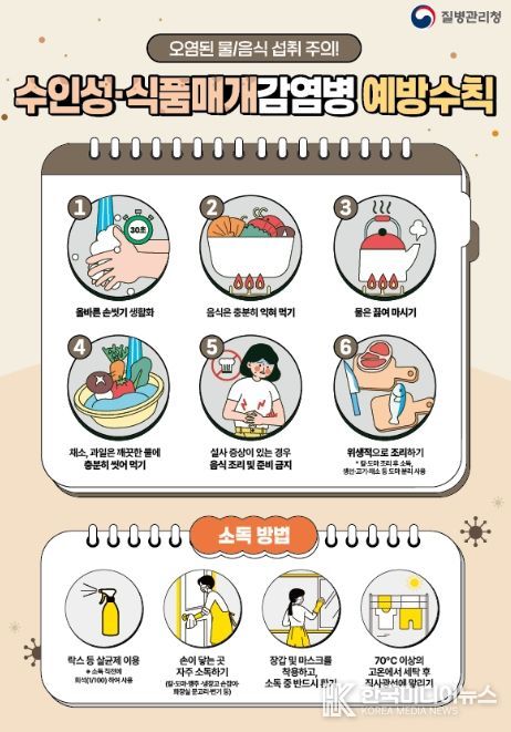 수인성ㆍ식품매개감염병은 병원성 세균, 바이러스, 원충에 오염된 물이나 식품을 섭취해 구토, 설사, 복통 등의 장관 증상을 유발한다. 이를 예방하기 위해서는 ▲올바른 손 씻기 생활화 ▲음식 충분히 익혀 먹기 ▲물 끓여 마시기 ▲채소ㆍ과일 깨끗한 물에 충분히 씻어 먹기 ▲설사 증상 시 음식 조리 및 준비 금지 ▲위생적으로 조리하기 등 예방수칙을 준수해야 한다.