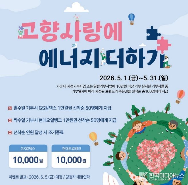 [ 한국미디어뉴스 이원영 기자 ] 원주시는 고향사랑기부제 활성화를 위해 5월 한 달간 특별 이벤트 ‘고향사랑에 에너지 더하기’를 추진한다.