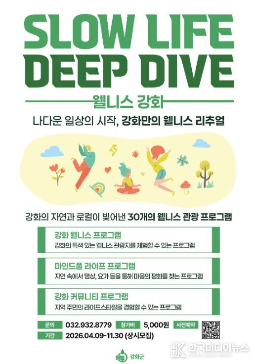 군 관계자는 “이번 웰니스 프로그램은 강화의 자연과 고유의 매력을 바탕으로 관광객에게 진정한 쉼과 치유의 경험을 제공하기 위해 마련됐다”며 “앞으로도 강화만의 특색을 살린 웰니스 관광 콘텐츠를 지속적으로 확대해 지역 관광 활성화에 힘쓰겠다”고 말했다.