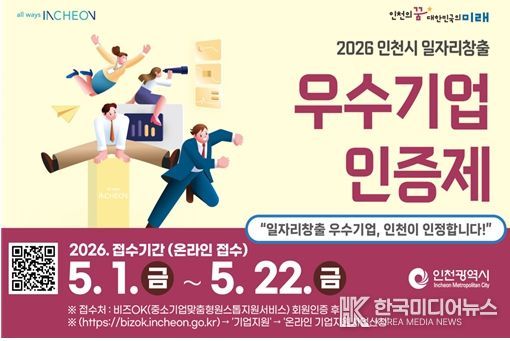 [ 한국미디어뉴스 이원영 기자 ] 인천광역시는 고용 창출뿐만 아니라 근로환경 개선까지 종합적으로 평가하는 ‘2026년 일자리창출 우수기업 인증제’를 시행한다고 밝혔다.