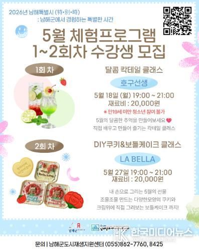 [ 한국미디어뉴스 김홍철 기자 ] 남해군 도시재생지원센터가 신록이 짙어가는 5월을 맞아, 군민들에게 일상 속 특별한 미식 경험과 힐링을 선사할 ‘5월 쿠킹클래스’를 마련하고 수강생 모집에 나선다.