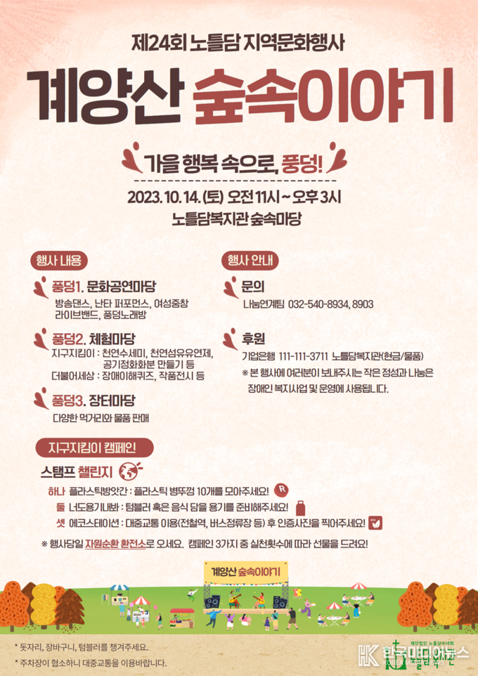[ 한국미디어뉴스 이원영 기자 ] 노틀담복지관(관장 이선애)은 오는 10월 14일(토) 복지관 숲속마당에서 제23회 '계양산 숲속이야기'를 개최한다고 밝혔다.
