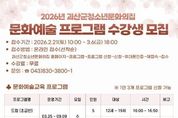 [ 한국미디어뉴스 김풍옥 기자 ] 충북 괴산군청소년문화의집이 청소년들의 창의적 역량과 전인적 성장을 지원하기 위한 ‘2026년 문화예술 프로그램’ 수강생을 모집한다고 20일 밝혔다. 이번 프로그램은 청소년들이 문화·예술·체육·학습 분야의 다양한 활동을 경험하며 자기표현 능력과 정서적 안정, 건강한 여가문화를 형성할 수 있도록 기획됐다. 강좌는 예술, 체육, 학습 분야 등 총 10개 과정으로 구성됐다. 세부 프로그램으로는 △드럼 △바이올린 △발레 △댄스 등 예술 강좌와 △요리 △포켓볼 △탁구 등 체험·체육 강좌, 그리고 △생명과학 △주산 △기초학습&보드게임 등으로 구성돼 청소년들의 선택 폭을 넓혔다. 특히 ‘기초학습&보드게임’ 프로그램은 대청교(대학생 청소년 교육 멘토링)와 함께 운영된다. 국어·수학·영어 등 교과 중심 학습지도와 보드게임을 병행하고 정서 멘토링 활동도 함께 진행해 학습 흥미와 자신감을 높일 계획이다. 수강 신청은 오는 21일부터 3월 6일까지며 괴산군청소년문화의집 홈페이지를 통해 선착순으로 진행된다. 박은순 가족행복과장은 “이번 문화예술 프로그