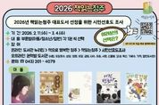 [ 한국미디어뉴스 김풍옥 기자 ] 청주시립도서관은 2026년 ‘책읽는청주’ 대표도서 선정을 위한 시민선호도 조사를 3월 4일까지 진행한다고 11일 밝혔다. 이번 선호도 조사는 청주시 시민과 독서전문가들이 추천한 291여권 가운데, 책읽는청주 추진위원회가 엄선한 아동·청소년·일반 부문별 5권씩 총 15권을 대상으로 실시한다. 아동부문 도서는 △이상권의 ‘29센티미터’ △백혜영의 ‘구구옥’ △고정순의 ‘난독의 계절’ △허교범의 ‘어린 변호사’ △성은경의 ‘우당탕탕 또경이’이다. 청소년부문 도서는 △백혜영의 ‘꿈을 걷는 소녀’ △성해나의 ‘두고 온 여름’ △최현진 ‘스파클’△김하연의 ‘시간을 건너는 집’ △추정경의 ‘열다섯에 곰이라니’이다. 일반부문 도서는 △문유석의 ‘나로 살 결심’ △최태규의 ‘도시의 동물들’ △김홍의 ‘말뚝들’ △장강명의 ‘먼저 온 미래’△황석영의 ‘할매’이다. 선호도 조사 결과는 대표도서 최종 선정을 위한 참고자료로 활용되며, 최종 대표도서는 3월 25일 개최되는 책읽는청주 추진위원회에서 결정될 예정이다. 참여는 청주시민 누구나 가능하며, 아동·청소년·일