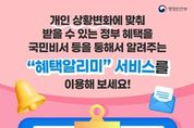 [ 한국미디어뉴스 이원영 기자 ] 개인 상황변화에 맞춰 받을 수 있는 정부 혜택을 국민비서 등을 통해서 알려주는 "혜택알리미" 서비스를 이용해 보세요! · 알림 대상 혜택 행정·공공기관이 제공하는 모든 공공서비스(6,000여종) · 이용 대상 국민 누구나(*만 14세 미만 제외) · 이용 방법 ① 정부24 접속 ② 혜택알리미 가입·이용 *다음 페이지 참고 ■ 혜택알리미 이용 동의 방법 ① 정부24 웹페이지 또는 정부24 어플을 통해 접속해 주세요. ■ 혜택알리미 이용 동의 방법 ② 모바일에선 정부24 하단에 "혜택알림"을 통해 바로 접속 가능해요. ■ 혜택알리미 이용 동의 방법 ③ 동의 후 맞춤 혜택 알림 받기를 클릭해주세요. 본인인증 이후 이용동의를 진행해 주세요. ■ 혜택알리미 이용 동의 방법 ④ 정부24 회원가입 시 혜택알리미 서비스 이용동의를 선택해 주세요. - 혜택알리미 이용약관에 동의하면, 맞춤혜택 알림 등 다양한 서비스를 제공받을 수 있어요! ■ 혜택알리미 이용 동의 방법 ⑤ 회원가입을 위한 회원 정보를 입력하고 간편인증을 진행해 주세