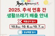 [ 한국미디어뉴스 이원영 기자 ] 태백시는 추석 연휴 기간 원활한 생활폐기물 수거와 쾌적한 도시 환경 유지를 위해 연휴 전인 10월 3일·4일, 연휴 후인 8일·9일에 생활폐기물을 정상 수거한다고 밝혔다. 연휴 동안에는 배출일을 반드시 준수해야 하며, 특히 단독주택 지역은 장기간 방치로 인한 악취와 환경오염이 발생하지 않도록 각별한 주의가 요구된다. 또한, 시는 10월 3일부터 9일까지 ‘생활폐기물 대책상황반’과 기동처리반(생활환경팀 )을 운영해 불법 투기 및 관련 민원에 신속히 대응할 방침이다. 태백시 관계자는 “시민 여러분의 작은 협조가 더 깨끗한 명절을 만드는 힘이 된다”며 “생활폐기물은 3·4일과 8·9일 정상 수거가 이뤄지니 반드시 기억해 주시기 바란다”고 말했다.