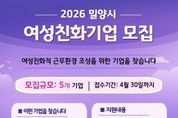[ 한국미디어뉴스 최정화 기자 ] 경남 밀양시는 여성의 경제활동 참여를 독려하고, 일과 가정이 조화로운 기업 문화를 확산하기 위해 오는 4월 30일까지 ‘2026년 밀양형 여성친화기업’을 모집한다. 경남 도내 최초로 도입된 밀양형 여성친화기업 인증제도는 여성 근로자가 일하기 좋은 환경을 갖춘 기업을 발굴·인증하고, 다양한 행정·재정적 인센티브를 제공함으로써 지역 내 여성 친화적 고용 환경을 조성하는 데 목적이 있다. 신청 대상은 밀양시에 사업장을 두고 있으며, 근로자 5인 이상 기업 중 여성 근로자 비율이 20% 이상인 곳이다. 참여를 희망하는 기업은 4월 30일까지 밀양시 여성가족과로 방문하거나 우편 또는 이메일을 통해 신청서를 제출하면 된다. 시는 접수된 기업을 대상으로 현장 실사를 거쳐 최종 인증 기업을 선정할 계획이다. 인증 기업에는 연차별로 ▲1년 차에는 기업환경개선 지원 ▲2년 차부터는 여성친화 직장문화 조성 지원 등 단계별 인센티브를 지원한다. 이 외에도 ▲여성친화기업 인증패 수여 ▲찾아가는 양성평등 교육 ▲우수기업인 표창 추천 ▲밀양시 기업지원 보조금 사업 가점 부여 등 다양한 혜택