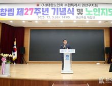 [ 한국미디어뉴스 이보영 기자 ] 수원특례시의회는 3일 권선구청 대회의실에서 열린‘대한노인회 수원시 권선지구 제27주년 기념식 및 노인지도자대회’에 참석해 어르신 지도자들의 노고를 축하하고 격려했다. 이번 행사는 이재식 의장을 비롯한 이찬용 도시미래위원장, 윤경선 인사청문특별위원장, 유재광 의원, 대한노인회 지회 관계자, 경로당 회장 등이 함께했으며 축하공연을 시작으로 노인강령 낭독, 연혁보고, 시상, 노인지도자 노래자랑 등이 이어졌다. 이재식 의장은 “경로당은 어르신들께서 즐겁게 하루를 보내실 수 있도록, 일상을 든든하게 지켜주는 소중한 공간”이라며 “수원특례시의회는 경로당을 중심으로 어르신들께서 더욱 활력 넘치는 노후를 보내실 수 있도록 경로당 복지 강화를 위해 앞으로도 최선을 다하겠다”고 말했다.