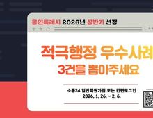 [ 한국미디어뉴스 이원영 기자 ] 용인특례시는 26일부터 다음달 6일까지 시 홈페이지 시민참여 게시판과 소통24에서 전 국민을 대상으로 투표를 진행한다고 밝혔다. 시는 매년 상하반기 창의력과 전문성을 발휘해 불합리한 규제를 개선하고, 시의 발전을 이끈 정책을 적극행정 우수사례로 선정하고 있다. 올해 상반기 적극행정 사례 투표 대상은 ▲외팔보(캔틸레버) 인도교 상하반기 정기안전점검 제도화 ▲구성적환장 개선 사업 ▲세종포천고속도로 동용인IC(가칭) 연결 허가 조기 승인 ▲환경기초시설에 연구개발(R&D)‧민관협치로 부가 수익 창출 ▲반도체 산업용지 확대 공급 ▲맞춤형 학교 제설지도 제작 ▲테마파크 다회용 컵 도입 ▲지하시설물 통합관리 협의체 ▲용인시 국민신문고 개설 ▲공익사업으로 토지 수용 시 부수토지에 대한 양도세 비과세 배율 유지 ▲층수 대신 높이 기준으로 소방관 진입창 설치 기준 개선 ▲방치된 향토문화유적 ‘세심정’ 복원 ▲위기 청년 원스톱 맞춤형 솔루션 연계 ▲방치된 독정교 하부 공간을 시민 공간으로 조성 등 15건이다. 투표 기간은 26일부터 2월 6일까지다. 투표는 누구나 참여할 수 있다.