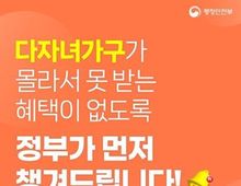[ 한국미디어뉴스 황영수 기자 ] ■ 다자녀가구가 몰라서 못 받는 혜택이 없도록 정부가 먼저 챙겨드립니다! ▷ 혜택알리미 - 내가 몰라도 찾아서 알려주는 개인 맞춤형 알림 서비스 · 다자녀 국가장학금 · 사회적 배려대상자 도시가스요금 경감 · 전기 요금 복지할인 · 에너지복지요금 지원 · 다자녀가구 자동차취득세 감면 ※ 소득, 거주지 등 개인별 상황에 따라 받을 수 있는 혜택은 달라질 수 있어요. ■ 청년이 몰라서 못 받는 혜택이 없도록 정부가 먼저 챙겨드립니다! ▷ 혜택알리미 - 내가 몰라도 찾아서 알려주는 개인 맞춤형 알림 서비스 · 청년 일경험 지원 · 청년농 창업투자 심층 컨설팅 · 청년주택드림 청약통장 · 청년 월세 한시 특별 지원 · 청년 문화예술패스 지원 ※ 소득, 거주지 등 개인별 상황에 따라 받을 수 있는 혜택은 달라질 수 있어요. ■ 어르신이 몰라서 못 받는 혜택이 없도록 정부가 먼저 챙겨드립니다! ▷ 혜택알리미 - 내가 몰라도 찾아서 알려주는 개인 맞춤형 알림 서비스 · 65세 이상 폐렴구균 국가예방접종사업 · 노인 무릎인공관절 수술 지원 · 노인 일자리 및 사회활
