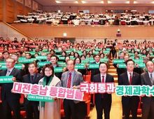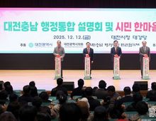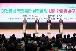 [ 한국미디어뉴스 이원영 기자 ] 대전시는 12일 시청 대강당에서 대전광역시의회, 대전충남 행정통합 민관협의체(이하 민관협)와 공동으로 “대전충남 행정통합 설명회 및 시민 한마음 촉구대회”를 개최하고, 대전충남 행정통합 특별법안의 조속한 국회 심의․의결을 촉구했다. 이날 행사는 최근 대통령이 행정통합의 필요성을 공식 언급하면서 통합 논의가 새로운 전기를 맞은 가운데 마련됐으며, 약 600명의 시민이 참석해 추진상황을 공유하고 통합 의지를 결집했다. 이창기 민관협 공동위원장은 지난 10월 2일 특별법안 발의 이후 경과를 소개하며, 통합으로 기대되는 효과를 설명했다. 이 공동위원장은 통합 시 인구 360만 규모의 초광역 혁신 클러스터 형성, 광역교통․생활권 확장 등 실질적인 변화를 강조하며 “행정통합은 수도권 일극체제에 대응할 충청권의 경쟁력 확보 전략”이라고 밝혔다. 설명회 후에는 통합을 촉구하는 퍼포먼스가 진행됐다. 이장우 대전시장, 조원휘 대전시의회의장, 이창기 민관협 공동위원장, 남재동 대전사랑시민협의회장이 관객석에서 행정통합을 촉구하는 구호를 선창하고 시민이 후창하는 카드섹션을 펼쳤으며, 이