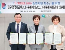 [ 한국미디어뉴스 이보영 기자 ] 대구시교육청은 12월 4일 오후 1시 30분, 접견실(본관 2층)에서 ‘E-순환거버넌스’, ‘사단법인 자원순환사회연대’ 등 2곳과 학교 기반 자원순환 체계 구축 및 ESG 환경교육 활성화를 위한 ‘E-Waste Zero, 순환자원 회수’ 업무협약을 체결했다. 이번 협약은 학교 현장에서 발생하는 폐전자제품과 폐휴대폰이 비제도권으로 유출되거나 부적정 처리되는 문제를 예방하고, 개인정보 유출 위험을 차단하는 안전한 회수·재활용 체계를 구축하기 위해 추진됐다. 이를 통해 환경적 가치와 사회적 가치를 동시에 실현하는 자원순환 모델을 학교 현장에 정착시키는 것이 목적이다. 협약에 따라, 대구시교육청은 학교에서 발생한 폐전자제품과 폐휴대폰을 E-순환거버넌스에 인계하고, 회수·재활용 체계에 대한 학교 안내와 홍보, 폐휴대폰 수거 캠페인 교육 협력을 담당한다. E-순환거버넌스는 폐전자제품의 안전한 처리와 친환경적 재활용, 회수·재활용에 따른 ESG 성과 제공, 사회공헌 기부금 영수증 발급 지원을 맡는다. (사)자원순환사회연대는 폐전자제품 회수·재활용 체계 모델 구축과 폐휴대폰