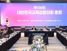 [ 한국미디어뉴스 이보영 기자 ] 대한민국교육감협의회(회장 강은희 대구광역시교육감)는 1월 29일, 경기도 성남시 더블트리바이힐튼서울판교호텔에서 제106회 총회를 개최했다. 이번 총회에서는 전국 시도교육감 및 교육청 관계자, 협의회 사무국 관계자 약 200명이 참석하여 '사립학교의 ‘공직자 이해충돌방지법’ 적용을 위한 법령 개정 건의' 등 5개 안건을 심의·의결했고, '행정통합 추진에 따른 경과 및 쟁점'에 대해 교육의제로 토의했다. 이날 심의 안건은 ▲사립학교의 ‘공직자 이해충돌방지법’ 적용을 위한 법령 개정 건의, ▲외부강의 등 요청 표준서식 마련 요구, ▲‘보호자 협조·동의 관련’ 기초학력 보장법 및 동법 시행령 개정 요청, ▲교육활동 침해 학생의 학적변동 제한을 위한 법률 개정 건의, ▲학습지원 소프트웨어 관련 초·중등교육법 개정 제안으로 모두 5개의 안건을 심의·의결했고, 지난해 12월 11일 실무협의회를 통해 전국 17개 시도교육청의 전원 합의 과정을 거쳤다. 다음으로 2개 교육청에서 우수사례를 발표했는데, ▲(경기) 시·공간 경계를 넘어 세계를 잇는 한국어교육 온라인 경기한국어랭귀지스쿨(KLS 3