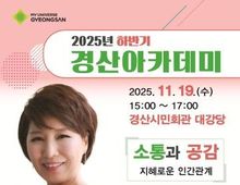 [ 한국미디어뉴스 이보영 기자 ] 경산시는 11월 19일 오후 3시 경산시민회관 대강당에서 『2025년 하반기 경산아카데미』를 개최할 예정이다. 이번 특강은 소통의 대명사 이호선 강사를 초청하여 ‘소통과 공감: 지혜로운 인간관계’를 주제로 진행할 예정이다. 대중의 눈높이에 맞춰 심리학을 쉽고 따뜻하게 풀어내는 전문가로 알려진 이호선 강사는 유쾌한 입담, 현실감 있는 사례, 삶을 바라보는 깊은 통찰로 공감을 끌어내는 소통전문 강사이다. 주요 저서로는 '마흔의 기술','이호선의 나이들수록: 관계편'등이 있으며, JTBC '이혼숙려캠프', CBS'세바시', EBS'부모멘토특강, 시월드에서 살아남기'등 다양한 방송에서도 활발히 활동하고있다. 하반기 경산아카데미는 온라인 신청(경산시 평생학습관 홈페이지), 전화 신청으로 사전예약을 받고 있으며, 잔여좌석이 있는 경우에 한하여 당일 현장접수도 가능하다. 경산아카데미는 시민들의 삶의 질 향상과 평생학습 문화 확산을 위해 다양한 분야의 명사들을 초청해 인문·교양 특강을 제공하는 프로그램으로, 지난 상반기에는 심리학자 김경일 교수의 특강이 큰 호응을 얻은 바 있으며 이번 하반