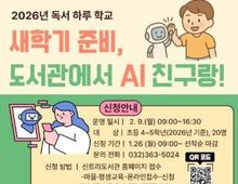 [ 한국미디어뉴스 이원영 기자 ] 인천광역시교육청신트리도서관은 관내 초등학생의 독서활동 기반 디지털 역량 향상을 위해 ‘새학기 준비, 도서관에서 AI 친구랑!’을 오는 2월 9일에 운영한다. 이번 프로그램은 예비 초등학교 4~5학년 학생을 대상으로 운영하며, 독서활동과 결합된 AI 체험을 통해 학생들의 디지털 역량과 새학기 적응력을 높이고자 마련했다. 주요 내용은 ‘AI로 배우는 똑똑한 학교생활’, ‘독서력 UP! 나만의 독서 친구’, ‘새학기 집중력 향상을 위한 요리 활동’, ‘AI 그림 놀이터’, ‘AI 창작 교실’ 등 AI 체험과 책 읽기를 접목한 창의·융합형 독서 활동으로 구성됐다. 모집은 신트리도서관 누리집에서 1월 26일부터 선착순으로 진행되며, 자세한 내용은 도서관 누리집을 참고하거나 어린이자료실로 문의하면 된다.