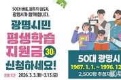 [ 한국미디어뉴스 이원영 기자 ] 광명시가 50대 중장년 시민의 배움 기본권 보장을 위해 올해도 평생학습지원금 지원을 이어간다. 시는 오는 3월 3일부터 13일까지 11일간 ‘2026년 광명시민 평생학습지원금’ 신청을 받는다고 26일 밝혔다. 광명시민 평생학습지원금은 생애 전환기를 맞은 50대 시민이 나이·소득·배경과 관계없이 배움을 지속할 수 있도록 생애 1회 1인당 30만 원의 평생학습이용포인트를 지원하는 사업이다. 시민 스스로 자신의 삶과 필요에 맞는 학습을 선택하도록 돕는 것이 핵심 목적이다. 박승원 광명시장은 “배움은 선택이 아닌 누구에게나 보장돼야 할 기본권”이라며 “시민이 나이나 환경의 제약 없이 언제든지 배움을 이어갈 수 있도록 평생학습 기반을 더욱 탄탄히 만들어가겠다”고 밝혔다. 신청 대상은 1967년 1월 1일부터 1976년 12월 31일 사이에 출생한 50대 광명시민이다. 광명시에 1년 이상 계속 거주했거나, 거주기간을 합산해 5년 이상 거주하고 있어야 한다. 시는 총 2천500명을 선정해 지원한다. 59세(1967년생)는 올해가 마지막 지원 대상임을 고려해 우선